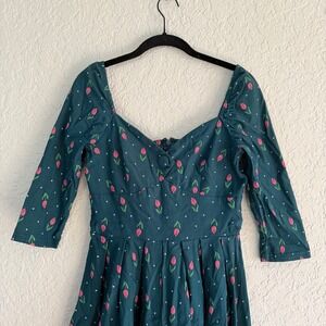 Unique Vintage Forest Green Lamar Swing MIDI Dress pink tulip & white polka dot