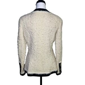 Classic CHANEL 4 pocket boucle jacket from 1994 runaway collection by Karl Lagerfeld. Iconic piece, quintessential Chanel. The jacket features ivory tweed with contrasting black trim and signature gold buttons.