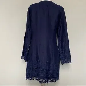 Malvin 100% Linen and Lace Trim Navy Embroidered Dress, Size Small 6