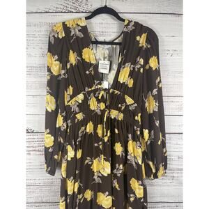 Wayf Dress Women's Size M Brown Yellow Floral Espresso Roses Long Sleeve Pockets