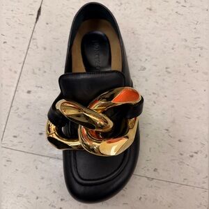 Brand New. Never Been Worn Black JW Anderson Buffed calfskin loafers / mules in black with large gold chain across the front. Very soft, cushioned, and comfortable. True to size.