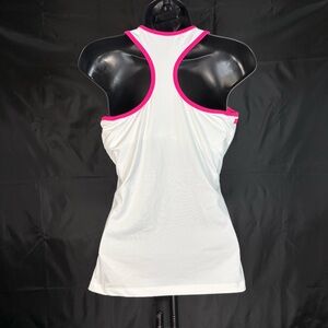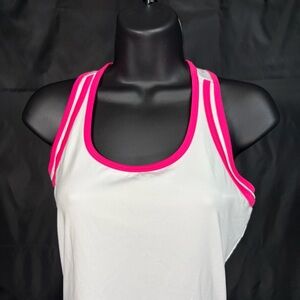 • Color: White with hot pink trim along the neckline and straps