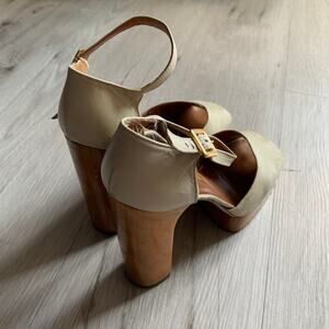 Material: Leather upper, wooden platform