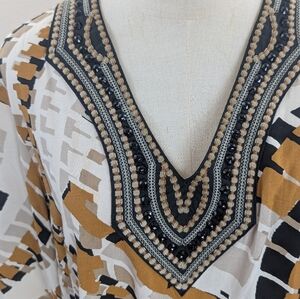 Chic tunic with abstract pattern. Features a stylish V-neck. Ideal for versatile wear. Multicolor, absteacr pattern. Embroidered and beaded detailing on the neckline. Size small. 3/4 sleeves. Rayon. Gently used, like-new condition. Item comes from a clean, smoke free home.