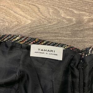 Tahari ladies pencil skirt. Size: 12. Small slit on back. Hidden zipper and hook & eye closure. Lined. Has metallic thread throughout - hard to see in the photo.