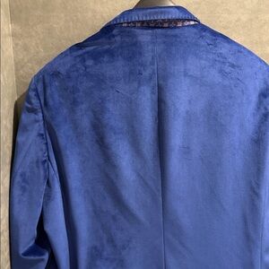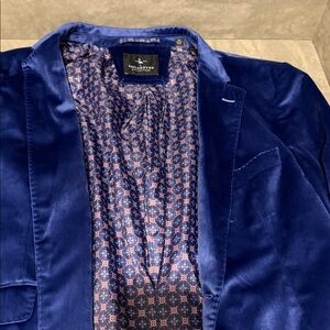 Luxurious royal blue velvet jacket. Features a stylish patterned lining. Ideal for sophisticated events.