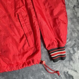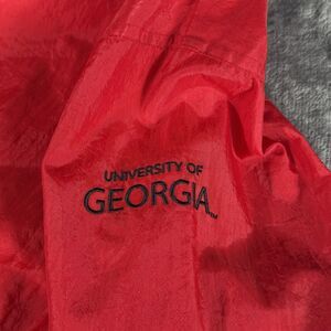 This product is a vintage size medium UGA Georgia Bulldogs 90s Champion windbreaker jacket featuring a big logo of the team. It is a rare find for fans of the college football team and would make a unique addition to any fan's collection of apparel and souvenirs. The red jacket bears the Starter brand, making it a sought-after piece for collectors and fans looking to show their support for the Georgia Bulldogs.