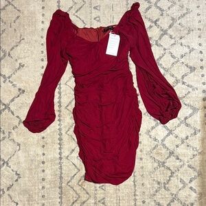 This elegant red dress features a stylish design perfect for any occasion. The vibrant color adds a touch of sophistication to your wardrobe. Bishop sheer sleeves