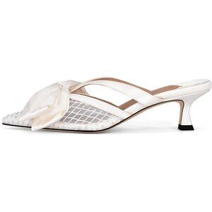 🆕Women White Faux Leather Heeled Mules Kitten Heel Pointed Toe Mesh Bow Sandals