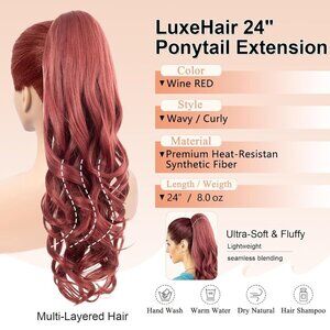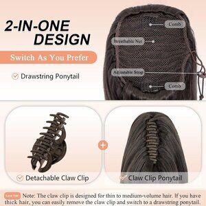 Features: Long, layered curly-wavy ponytail extension that clips in easily—perfect for adding volume and length fast. Light, durable, and made with heat-resistant fibers, so it stays fabulous all day without shine or frizz. Versatile 2-in-1 design with a claw clip and optional drawstring, giving you styling options for casual days or special nights.