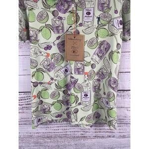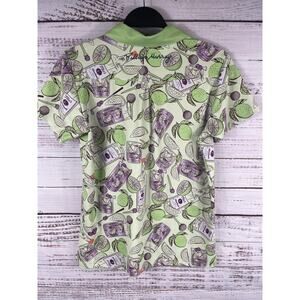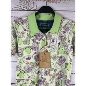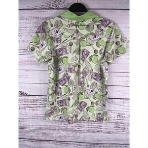 Color: Light green base with solid light green collar and multicolor graphic print featuring Tito's Handmade Vodka bottles, limes, citrus wedges, cherries, and cocktail glasses in green and purple tones.