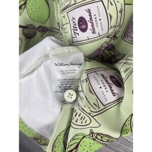Design details: Collared neckline with button placket, contrast plaid interior yoke, novelty Tito's "Transfusion" themed print, William Murray script logo detail at back, short sleeves, spare button attached to interior care tag.