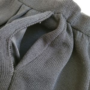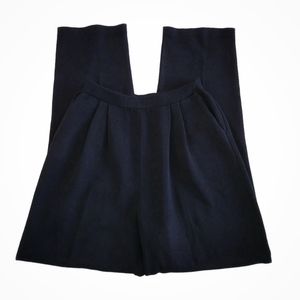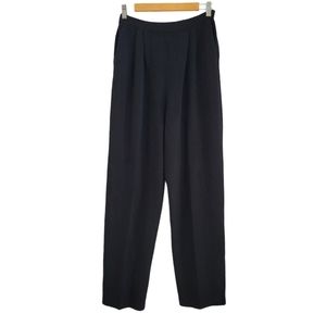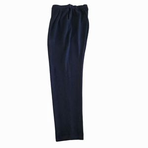 St. John Basics plain black santana knit pants with pleats in the front, pockets, and a high rise high waist. It is pull on with an elastic waist. The fabric content tag is missing. It is in very good used condition. No holes, no rips.