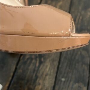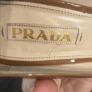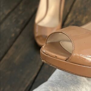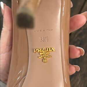 Chic patent Prada heels in a stylish nude. Size 38 1/2. All pictures show imperfections. Can be taken to shoe doctor to get taken out. So much more life left. Will price accordingly. Comes with a dust back and box but not the original. Comes from smoke free home but I do have fur babies.
