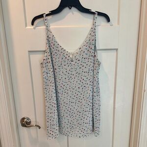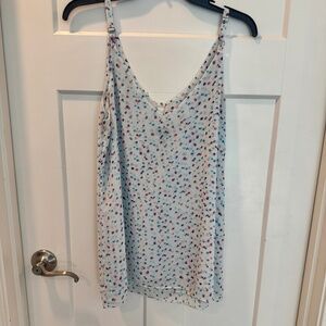 cabi Confetti Cami, Style #5231, Size M, EUC. Lightweight flow cami is a tinge of aqua base with colored polka dots. Chiffon, Lined, Adjustable straps. 100% polyester. Measures: 19" arm pit to arm pit. kd