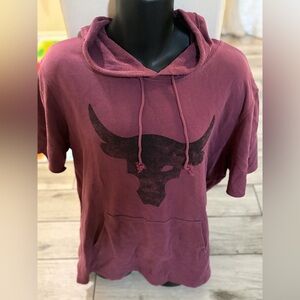 Men’s pre own rose red terry project rock size XL short sleeve hoodie Pre own items are as is any defects or errors of the item , the price has been modified to reflect. Photos with flash.