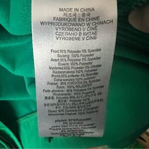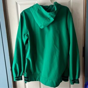 Stylish green ski jacket with hood. Features front zipper and multiple pockets. Perfect for winter sports.