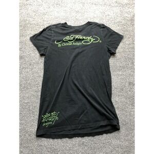 Logos/Markings: "Ed Hardy By Christian Audigier" script logo at front chest and across back, matching script along right side seam, and "Don Ed Hardy designs" print at back lower hem; interior Ed Hardy by Christian Audigier neck label with size 0X.