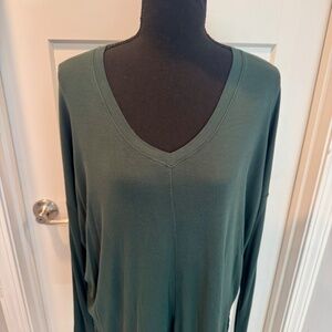 cabi Chill Tee, Style #3416, EUC, Size S, Hunter green long sleeve tee is oversized and flows for maximum comfort. Notched high-low hem. 97% rayon, 3% spandex. Measures: 27" arm pit to arm pit and 27 1/2" length. kd