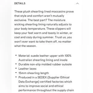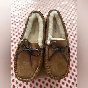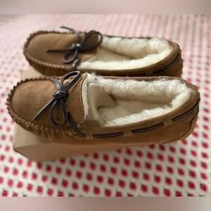These plush shearling lined moccasins are stylish and comfortable! The moisture wicking shesi g lining naturally adjusts to your body temperature and keeps you warm and toasty in the winter and cool and cozy in the summer. Brand new- never worn.