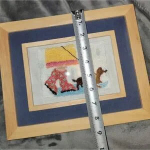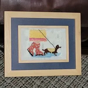 Handmade needle punch art with frame, titled "The Dog Walk."