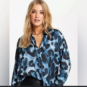 NWT Topshop Satin Blue Animal Print Button Down