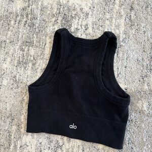 Sleek black crop top. Features racerback design. Perfect for workouts.