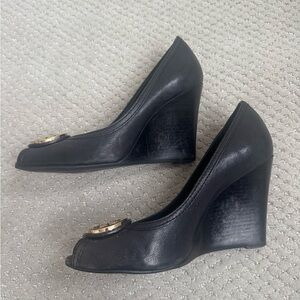 Tory Burch 4in Wedge heels with a peep-toe design. Black leather with a iconic Tory Burch gold emblem accent.