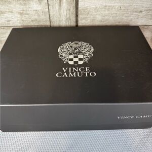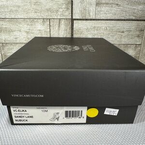 Chic, strappy Vince Camuto Elika heels in warm tan nubuck leather. Open toe caged design with ankle buckle and stacked heel gives instant polish with just enough edge. Size 10M. Gently used with light sole wear, uppers look great, comes with original box. Easy neutral that works year round with denim, dresses, or work looks. Heel approx 3.5 inches.