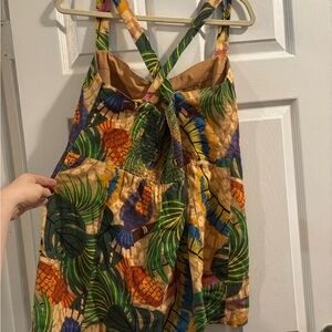 In good pre-owned condition. Mini dress. Measures 30 in long and has straps that can be straight or crossed in the back thanks to button closure.