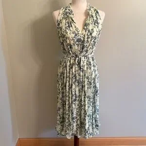 Beautiful, flowy summer or spring dress. Pale yellow color with blue floral design. Dress can be worn with an open collar or buttoned. Pleating throughout dress and tie sash make for a flattering silhouette. Dog friendly, non-smoking home.