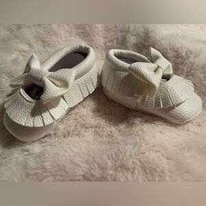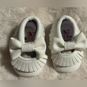 Adorable baby moccasins in white, featuring a cute bow design. Perfect for your little one's comfort and style. Minor flaw on bottom of baby moccasin. These are so precious!