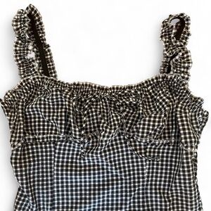 Stylish top with a gingham pattern. Features elegant ruffle accents. Perfect for the summer.