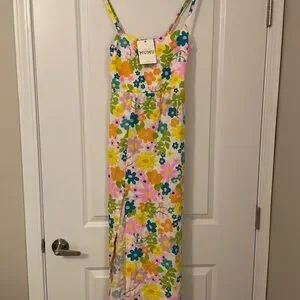 Embrace vibrant style with this sleeveless floral dress. Perfect for sunny days, it features a colorful floral pattern that adds a playful touch to your wardrobe. Groovy floral pattern. Linen blend. New with tags. Size medium.