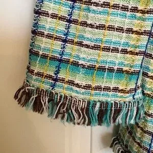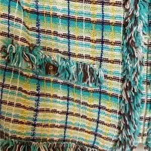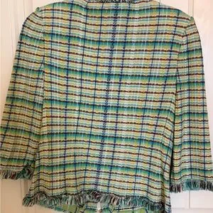 Chic plaid tweed blazer with fringe accents. Features a blend of vibrant colors. Perfect for elevating any ensemble.