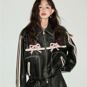 Stylish black leather jacket featuring charming pink accents. Perfect for adding a touch of elegance to any outfit. From the original designer of this jacket. Size small but is oversized can fit a M-L