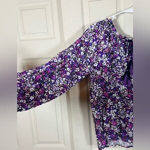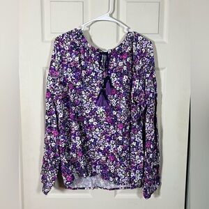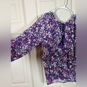 Flowy purple boho blouse with a delicate ditsy floral print and tassel tie neckline. Features soft balloon sleeves and a relaxed, slightly romantic silhouette that works beautifully with denim or layered under a cardigan.
