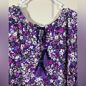 Purple Ditsy Floral Boho Blouse Tassel Tie Neck Flowy Top