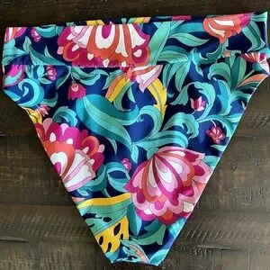 Elevate your swimwear game with these Trina Turk India Garden hi-waist reversible bikini bottoms in a beautiful blue floral pattern. These bottoms are perfect for any pool party with their stylish design and comfortable fit. Made of a durable blend of nylon and spandex, they are designed to stretch and provide a flattering silhouette.