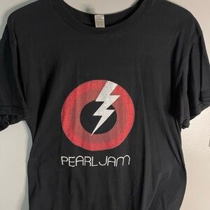 Black t-shirt featuring a red and white lighting bolt Pearl Jam logo. Perfect for fans.
