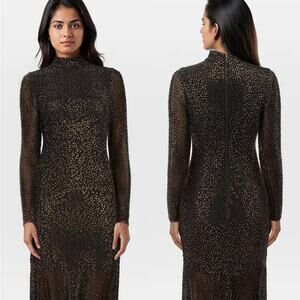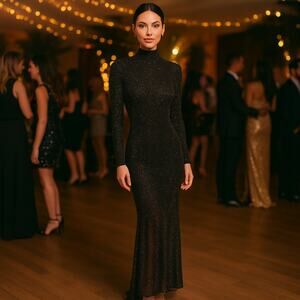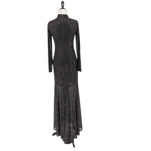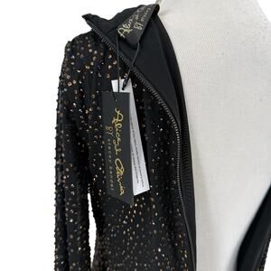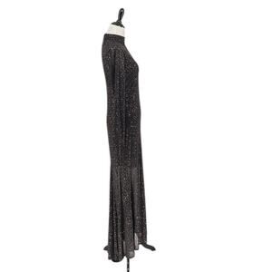 Flirty, fun, and fabulously chic, this Alice + Olivia Delora maxi dress is a standout for any event. Crafted in stretch black nylon with brown crystal embellishments throughout, this dress features an exposed zipper, mock neck, and long sleeves for a playful yet polished finish. This dress is perfect for cocktail parties, dinners, date nights, or special occasions.