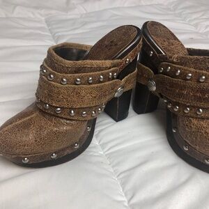 Stylish Vince Camuto cracked brown leather mules with silver studs and buckle accents. Comfortable chunky heel and easy slip-on style.