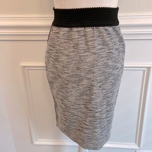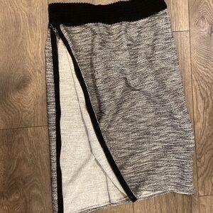 Anthropologie pencil skirt. Black and white. Black elastic waistband. Zipper on each side, unzips all the way up to waist to adjust slit length. Skirt is comfortable cotton material. Waist is 13 inches across, laying flat not stretched. Length is approximately 22 inches. New with tag.