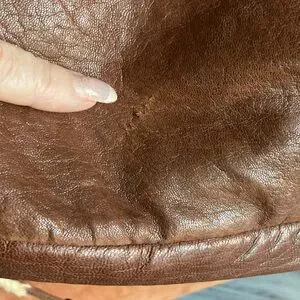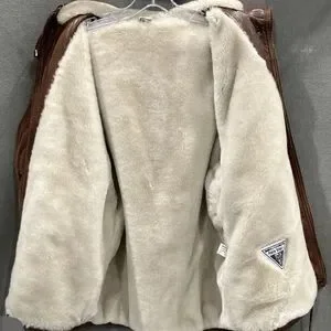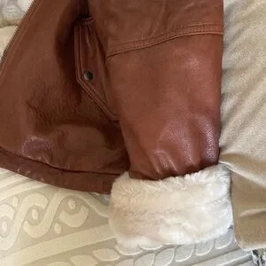 This is a very nicely made jacket/coat with minimal signs of wear. Brown soft leather exterior and thick WARM fur lining with gunmetal hardware.
