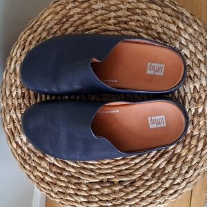 Trending comfort shoe brand Fitflop women's navy leather slip-on athleisure/casual slide mule clogs with padded footbeds. Pre-owned and in very gently used condition. Please see pictures.