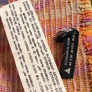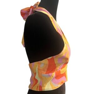 This is a pre-owned ZARA women's halter crop top in size M, featuring a vibrant abstract pattern in shades of orange, pink, yellow, and white.