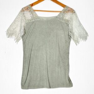Women's POL sage green t-shirt top with sheer lace short sleeves with eyelash cuff and deep V-neckline. Trimmed with lace detailing along the neckline and sleeve cuffs. The fabric has a slightly distressed, soft feel.