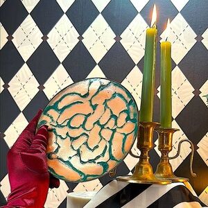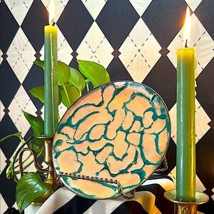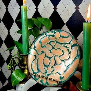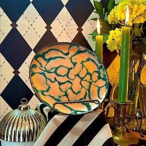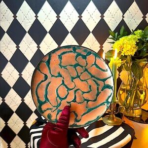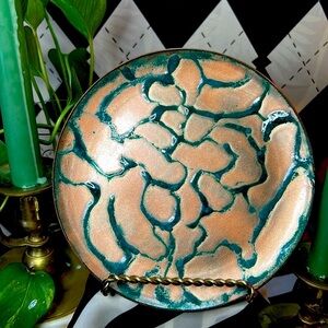 A stunning, one-of-a-kind copper enamel art plate bursting with vivid, layered color and mid-century flair. Each plate in this curated collection is uniquely hand-fired, resulting in mesmerizing tones and abstract, painterly effects that make every piece feel like its own miniature artwork.