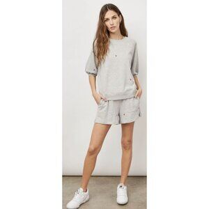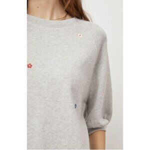 This fashion forward pullover style is perfect for relaxing at home or going about your day in the most comfortable fashion. Made from super soft lounge terry, this short sleeve heather grey crewneck sweatshirt features small multicolored embroidered daisies, a boxy fit, and raglan sleeves.