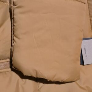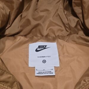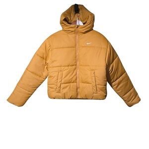 Stylish brown puffer jacket with hood. Features a sleek design and Nike logo.